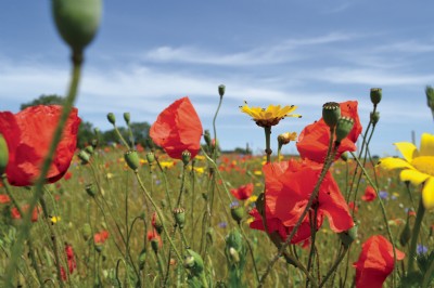An autumn sowing will produce earlier flowering plants in the spring season, producing a mass of flowers in late May and June with corn cockle, cornflower and poppy most abundant. A spring sowing favours the bright yellow corn marigold and leads to a later flowering period from Mid July onwards.