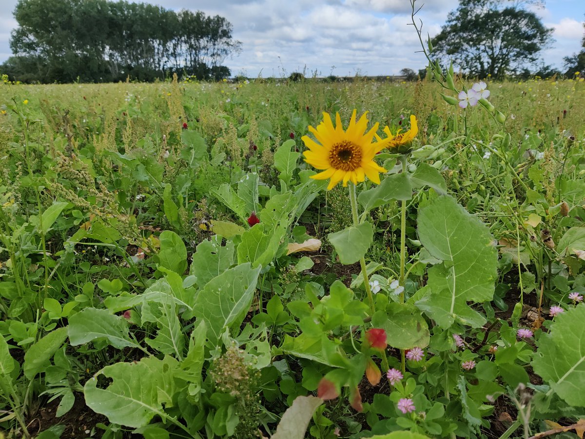 Sunflowers, radish, mustard, chicory and other goodies (with some good old fat-hen) in three hectares of organic wild bird seed mix adjacent to the marshes. I got some clover in the mix this year to better sustain it through two years.