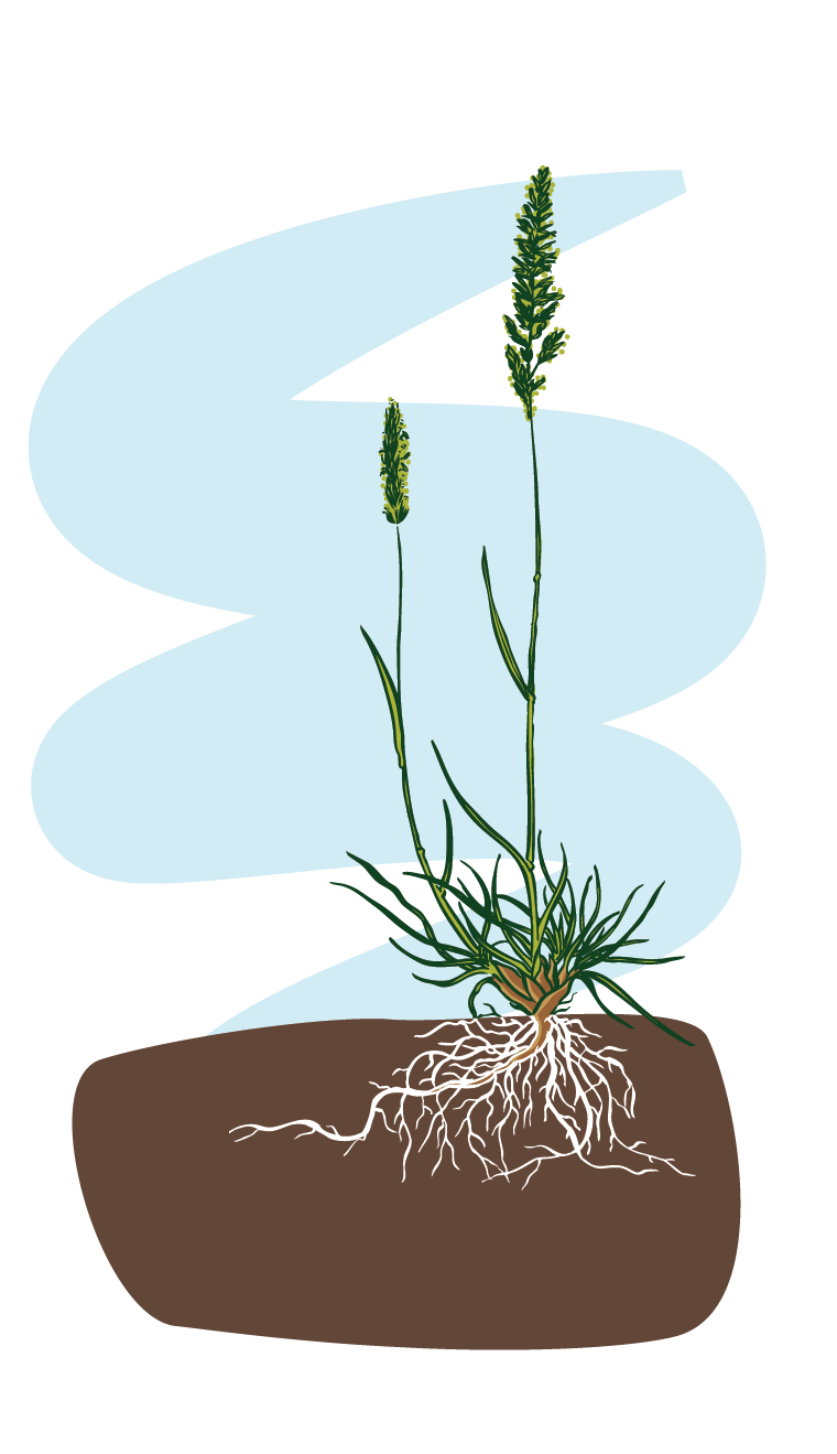 An upright plant producing greyish to green leaves from the base, some lower leaves are hairy, becoming hairless on the upper leaves. The ligules are short with a blunt tip and about 1mm in length.
