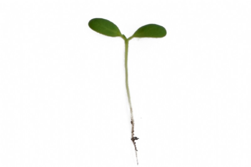 The seedling produces two rounded, oblong cotyledons, the first true leaf begins to form the leaflets.